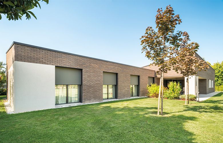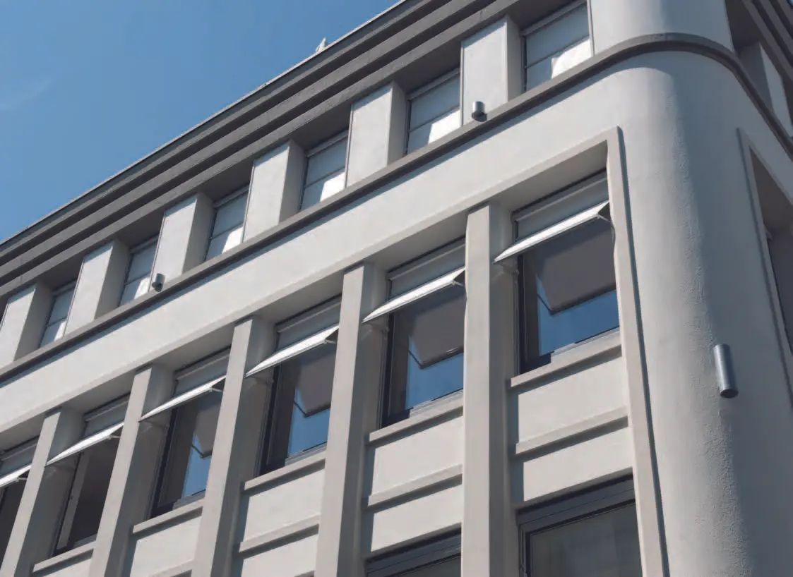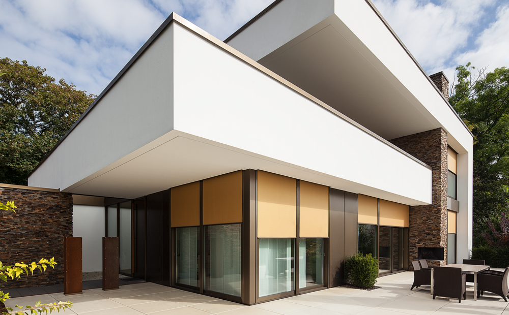 Die Senkrechtmarkise wird an Konsolen unsichtbar oberhalb des Fensters montiert, sie funktioniert wie eine zweite Gebäudehaut und bietet deshalb perfekten Hitze- und Blendschutz. Eine Senkrechtmarkise reflektiert die Sonnenstrahlen, meistert auch große Beschattungen an Sporteinrichtungen oder öffentlichen Gebäuden und eignet sich sehr gut für Büros mit Bildschirm-Arbeitsplätzen.