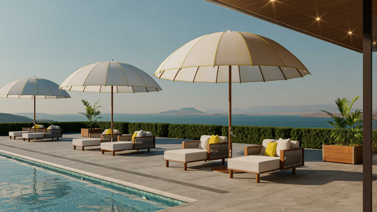 • Nicht alle bringen ihren eigenen Sonnenschutz mit. Durch fest installierte Sonnenschirme im Schwimmbad-Außenbereich verbessern Sie den Service deutlich und erhöhen die Zufriedenheit aller Gäste.