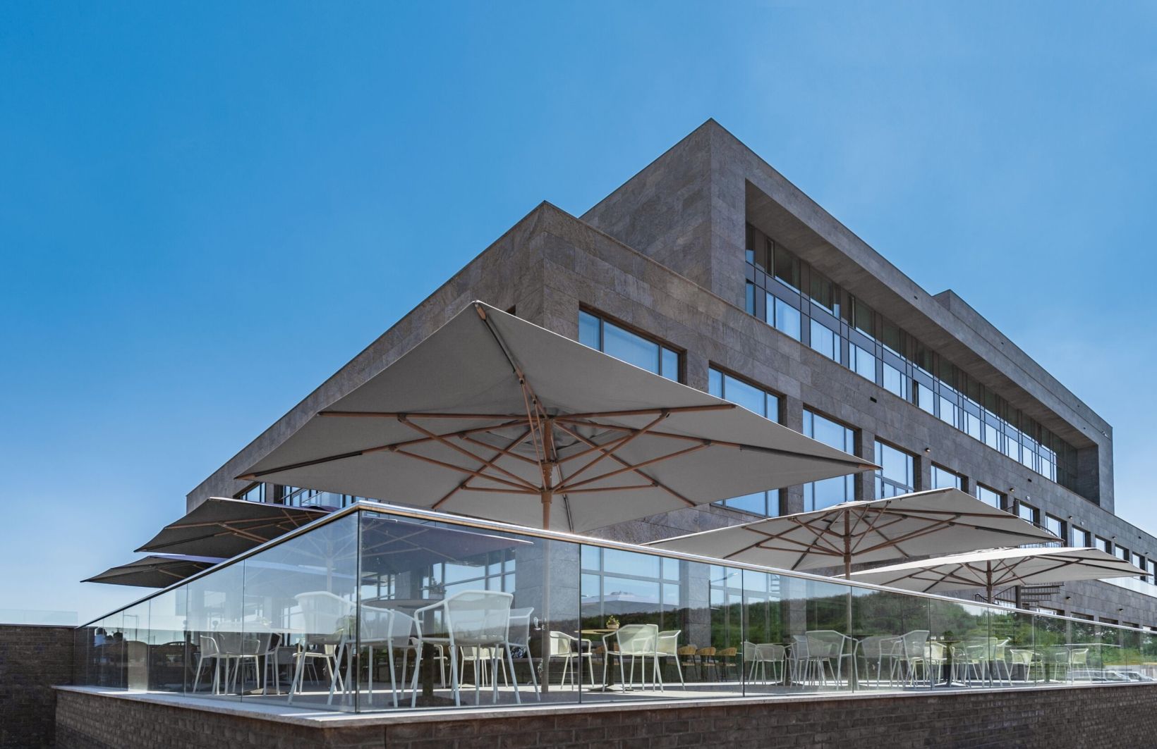 Moderne eckige Sonnenschirme für die Gastronomie
