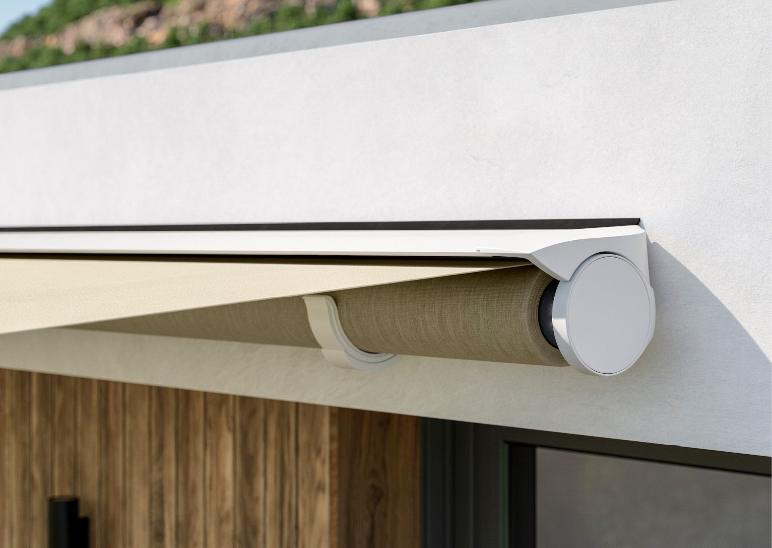 Steht die Sonne zu tief oder scheint die Sonne zu stark frontal auf die Terrasse, so ist ein Volant-Rollo ein perfekt Lösung. Der Volant-Rollo ist im Ausfallprofil der offenen Gelenkarmmarkise eingebaut und kann entweder mit einer manuellen Handkurbel oder mit einem Elektromotor ausgefahren werden. Meist wird das Tuch identisch zum Markisentuch gewählt, es sind auf Wunsch aber auch weitere Sonnenschutztücher möglich. Das Tuch kann bis zu 190cm senkrecht rausgefahren und mit einem Spannfix stabilisiert werden.