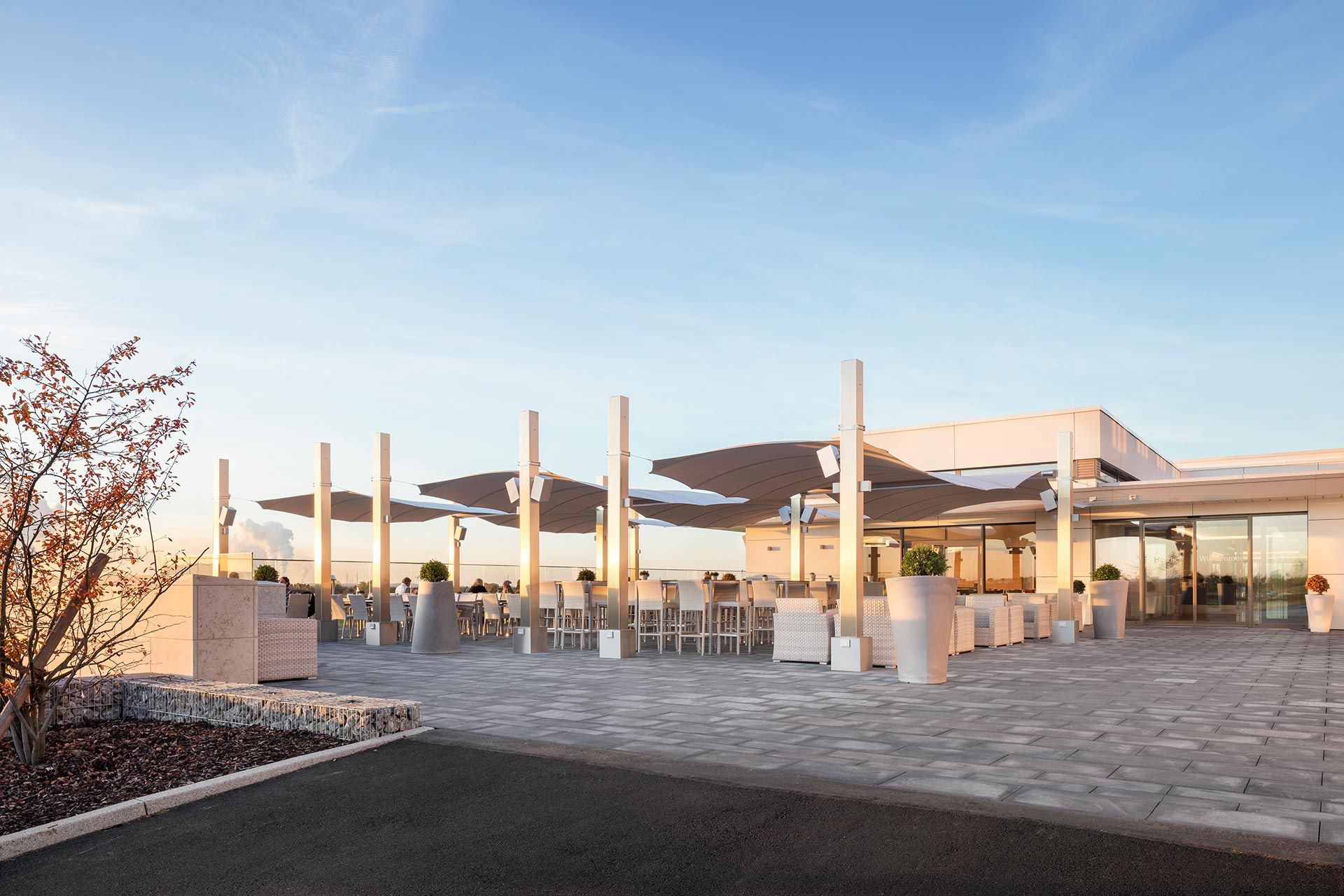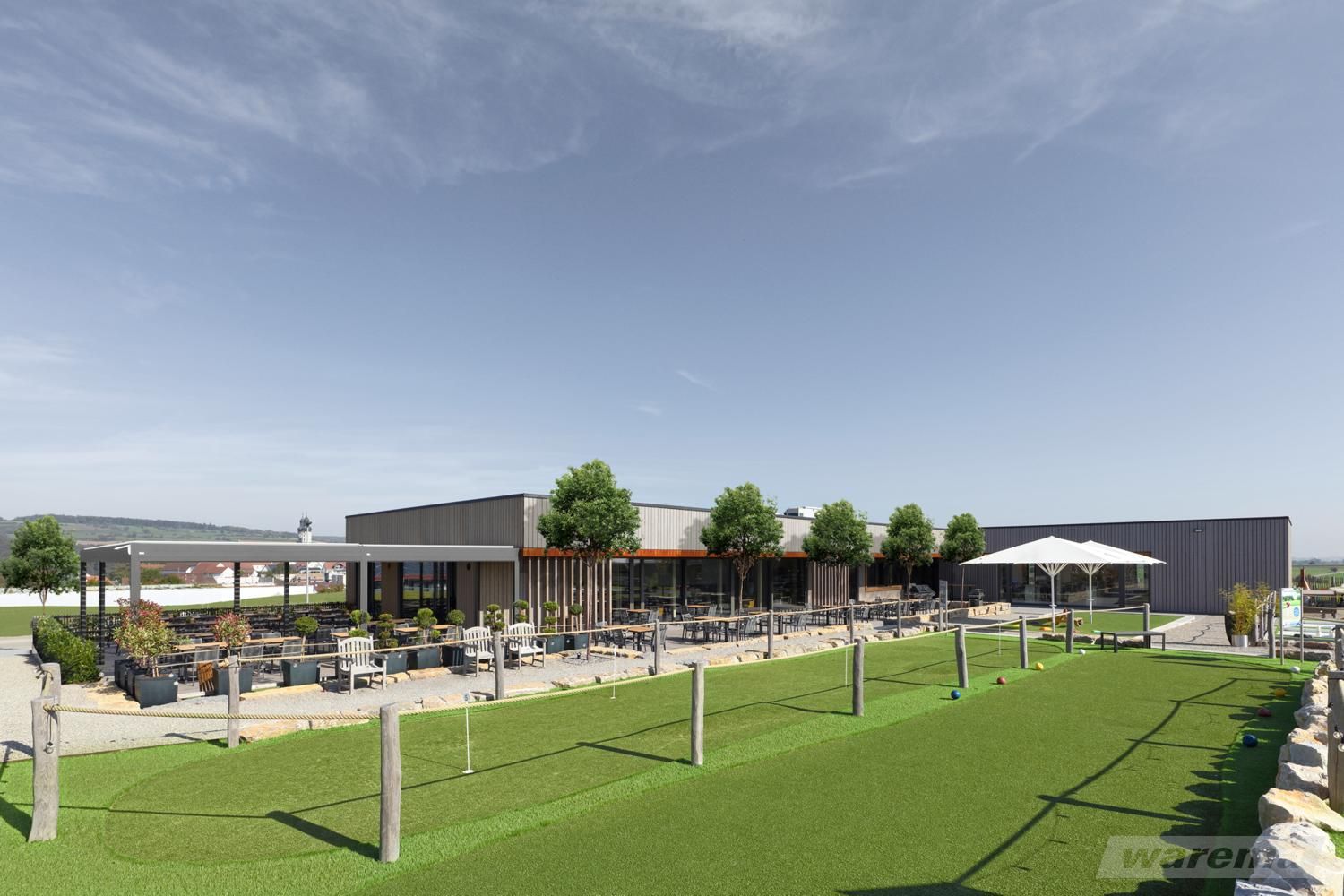 Das Clubhaus ist das Zentrum des Platzes. Es vereint Funktion, Gastlichkeit und Repräsentation. Doch wie bleibt es auch bei starker Sonne angenehm? Das Gebäude selbst kann mit außenliegenden Beschattungssystemen wie Jalousien oder Rollos ausgestattet werden. Sie reduzieren die Hitze im Inneren und lassen dennoch natürliches Licht durch. Die Terrasse lässt sich mit verschiedenen Elementen ausstatten: