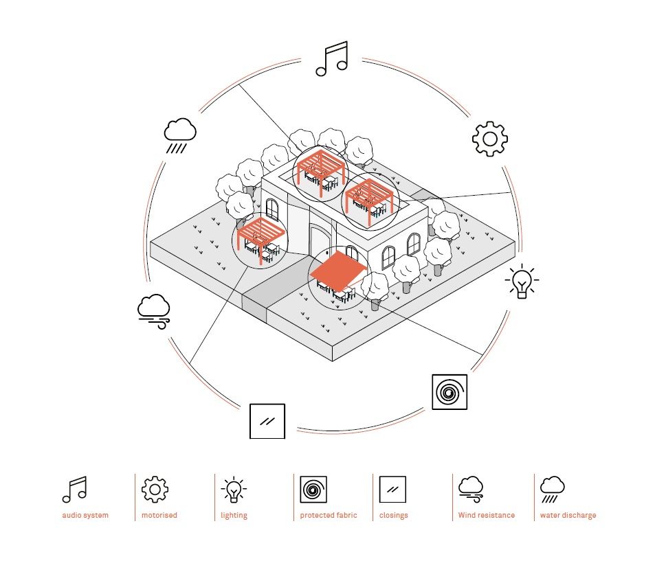 unterschiedlichsten Witterungsverhältnissen zu bieten. Je nach Produkt können Sie die Terrasse sogar ganzjährig nutzen, hierzu ist eine genaue Planung mit modernster Technologie und durch die Verwendung widerstandsfähiger und zertifizierter Materialien nötig. Mit dem vielseitigen Zubehör (LED-Beleuchtung, seitliche Verschlusssysteme mit Screens oder Glasscheiben, Heizungen) kann der Platz unter der Sonne von Gibus 365 Tage im Jahr genutzt werden. So haben Geschäfte und Lokale die Möglichkeit, den Außenbereich