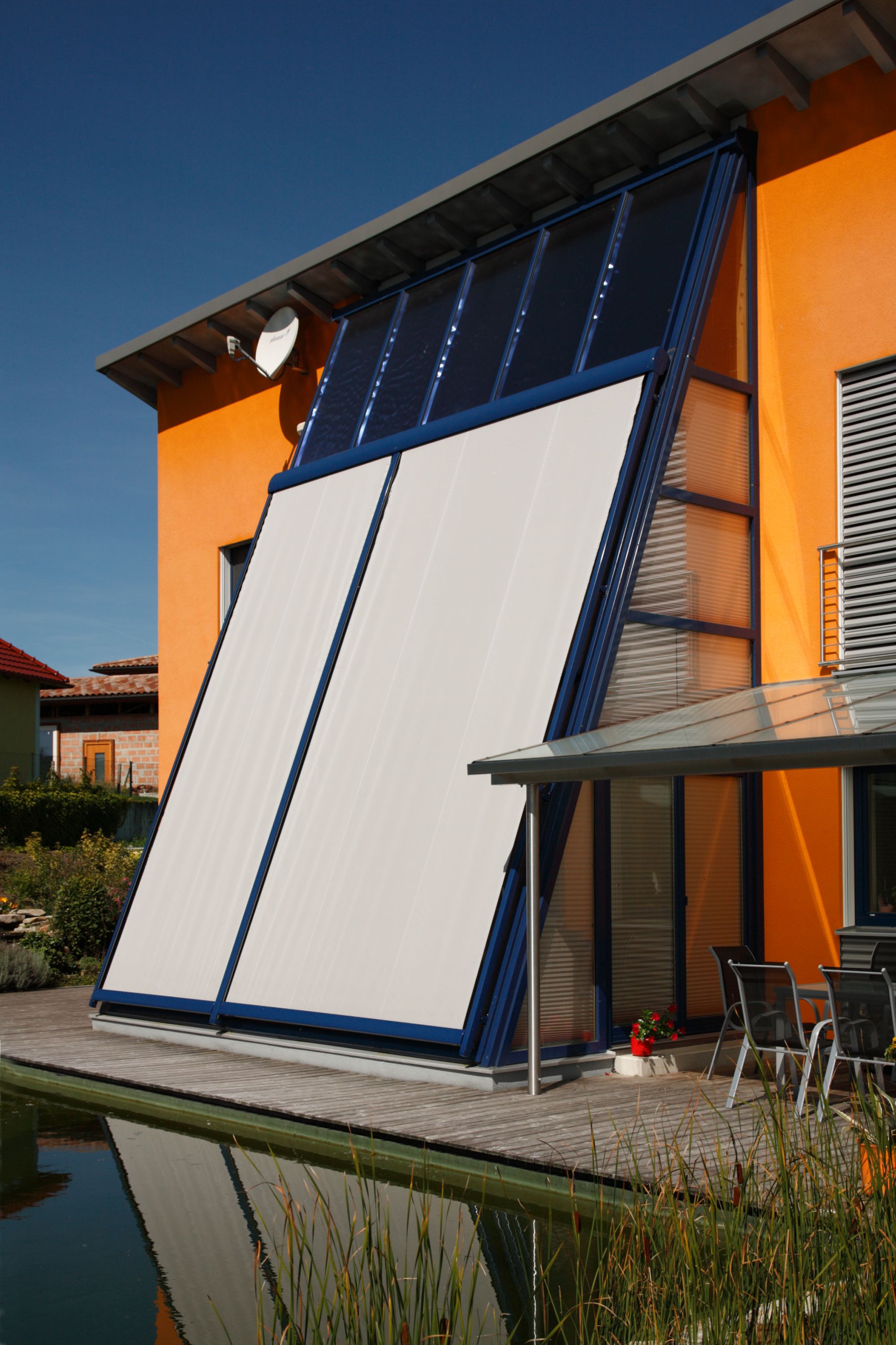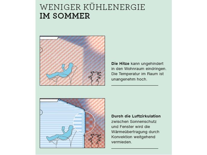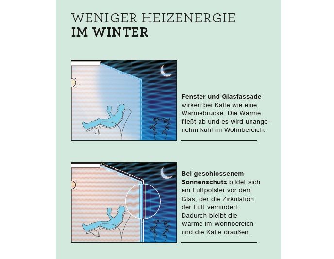Als Erweiterung des gebauten Raumes wirken Wintergärten wie eine eigene “Klimazone”. Die richtige und flexible Beschattung kann einen nachhaltigen Beitrag zu einer energieeffizienten Wärme- und Kälteregulierung auch in angrenzenden Wohnräumen leisten. So wird der Wintergarten zum wirksamen “Klimapuffer” und spart Energiekosten. Im Sommer lässt sich so die Wirkung der Sonnenstrahlen bis zu 85 % reduzieren. Im Winter können Sie eine Ersparnis durch das Heizen von bis zu 20 % erreichen.