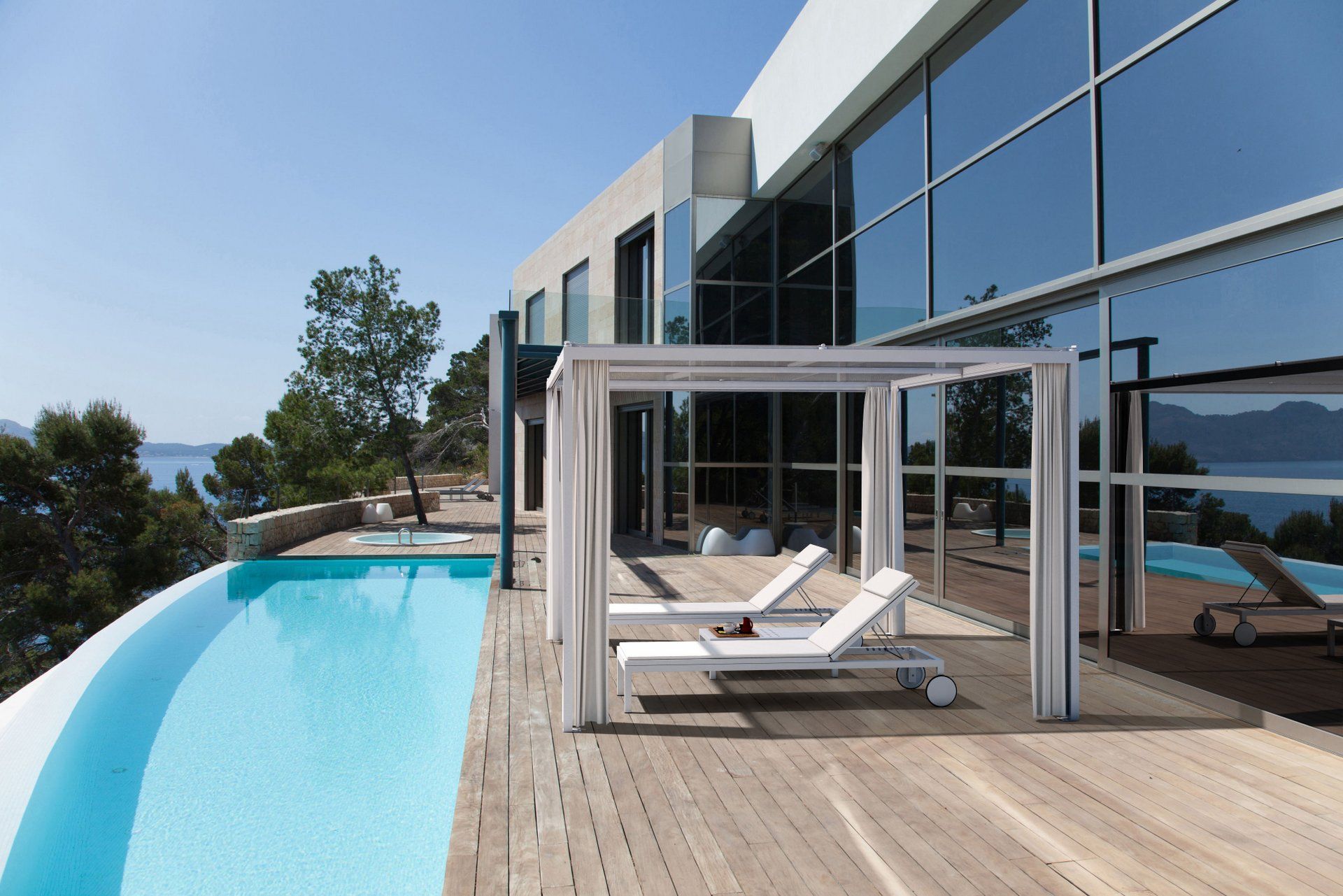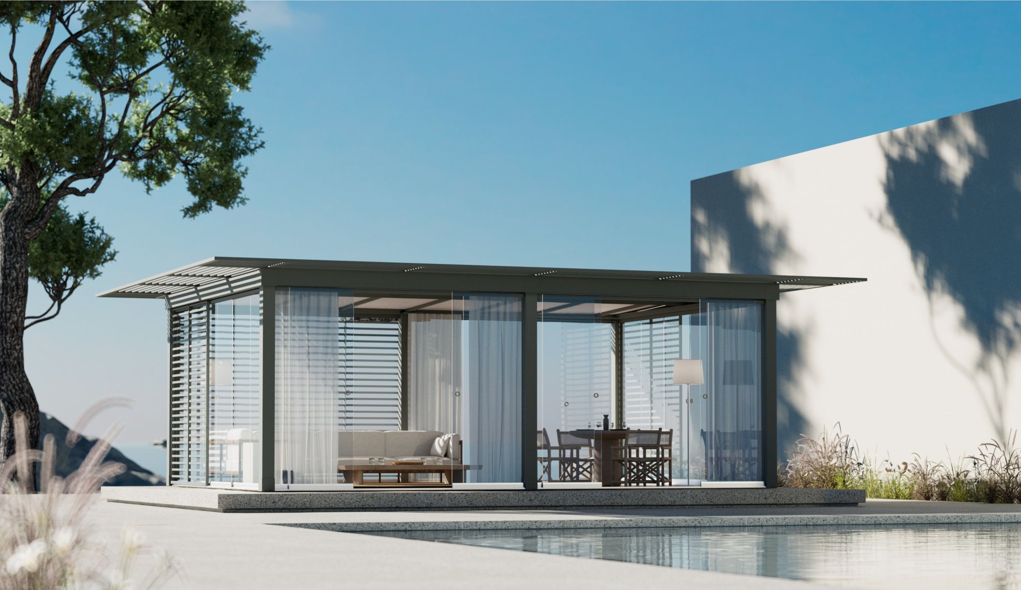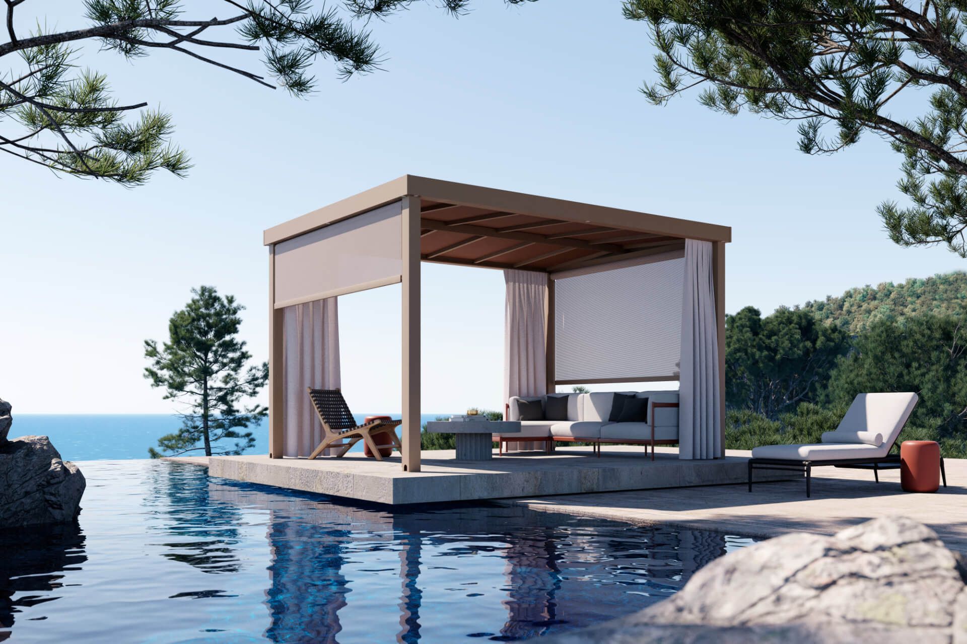 Besonders die freistehende Insel ist in der Gestaltung von einem Pavillon sehr beliebt. Bei einer Insel steht der Pavillon für sich und gilt als alleinstehendes Gestaltungselement. Der freistehende Pavillon kommuniziert 360° mit der Umwelt und muss deshalb sinnvoll gestaltet werden. Haben Sie einen windigen Ort, so sind Glasschiebtüren oder Rollos von Vorteil. Besonders für die Südseite sind Screens oder Vorhänge als Sonnenschutz perfekt geeignet. Der Pavillon kann als einen großen Raum gestaltet oder in Aufenthaltsbereiche aufgeteilt werden. Besondere Gestaltungelemente wie einen Dachüberstand im Lamellen-Design oder lockere Vorhänge, welche sich im Wind mitbewegen, kommen sehr gut zur Geltung.