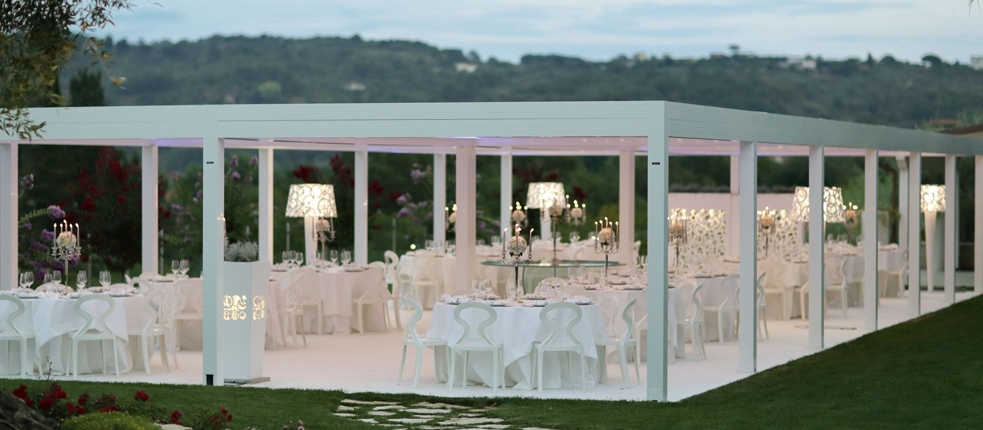 So entsteht ein durchgehender Schattenbereich, in dem sich die Gäste wohlfühlen unabhängig davon, ob sie zu zweit dinieren oder eine Gesellschaft bewirtet wird.