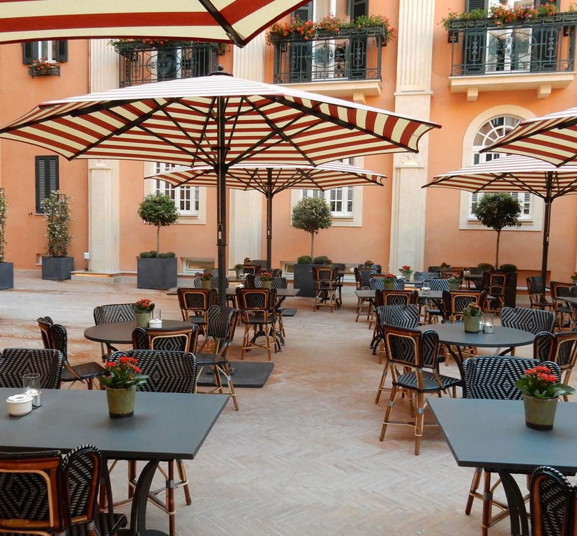 Ein guter Sonnenschutz im Restaurant Außenbereich muss nicht nur funktionieren, sondern darf auch schön sein. Farben, Formen und Drucke verwandeln die Technik in ein Element des Erscheinungsbildes.