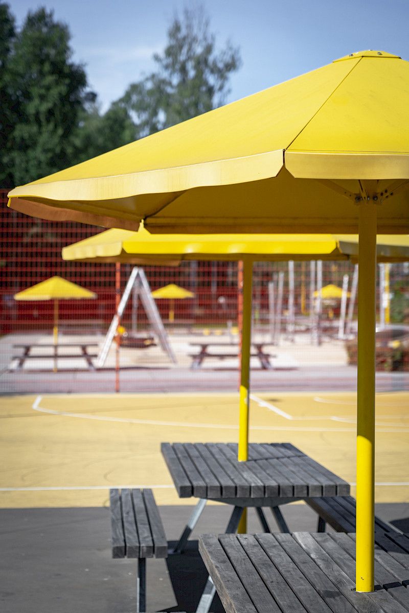 • Mobile Schattenspender wie große Sonnenschirme, die sich bei kleinen Grundschulen oder Kita-Außenbereichen flexibel einsetzen lassen. Durch gezielte Beschattung entstehen Orte der Ruhe, der Kommunikation und des Wohlbefindens. So wird aus einem einfachen Hof ein echter Aufenthaltsbereich und zwar auch bei Sonne.