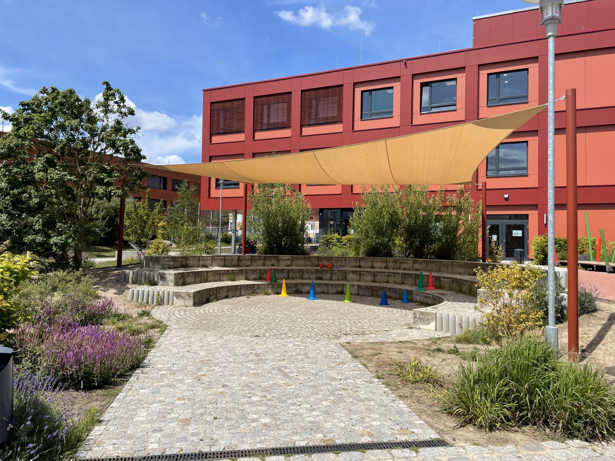 Viele Schulen nutzen ihre Außenflächen für Veranstaltungen, Projekte oder ein grünes Klassenzimmer. Flexible Beschattungssysteme unterstützen diese Aktivitäten optimal: