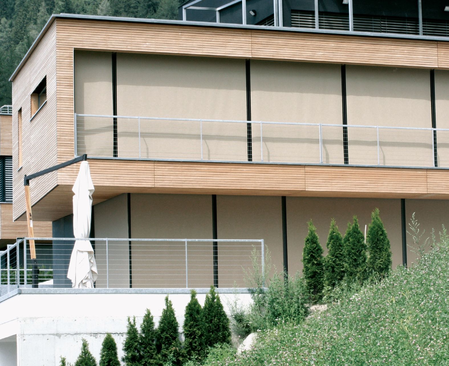 Markisenstoff: Der klassische Markisenstoff aus Acryl oder Polyester kann auch zur Ausführung kommen, dies ist wirkt besonders schön, wenn weitere Sonnenschutzanlagen verbaut werden mit dem gleichen Stoff. Der Markisenstoff gewährt dem Nutzer bei heruntergefahrener Anlage keine Aussicht nach außen. Es stehen bis zu 250 verschiede Markisentücher zur Wahl, in allen erdenklichen Farben und Mustern.