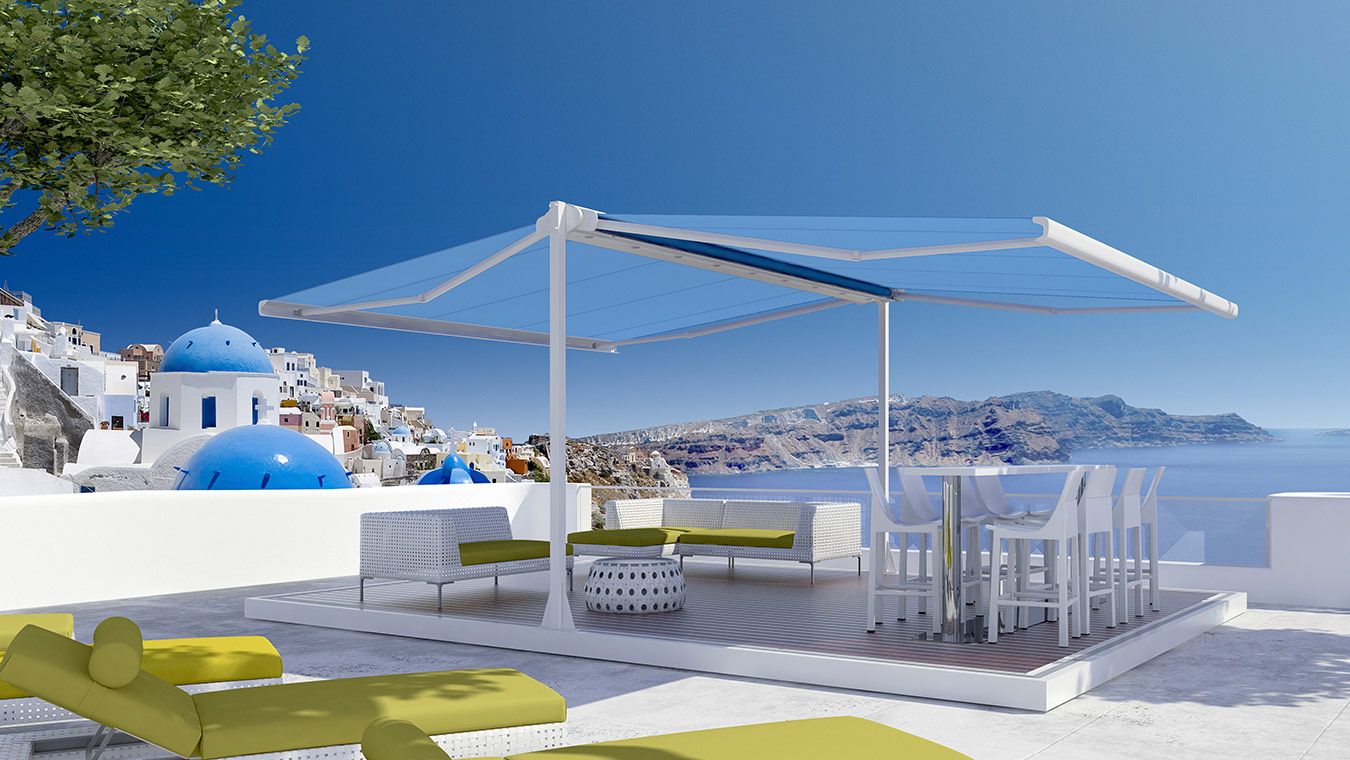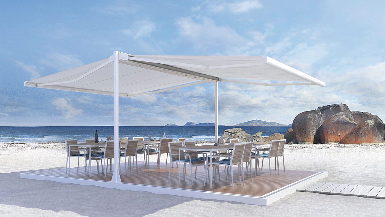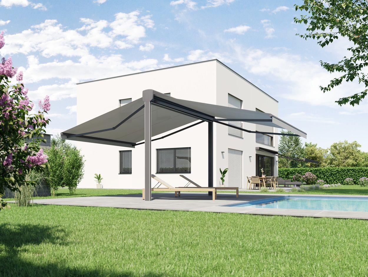 Die freistehende Doppelmarkise mit zwei ausfahrbaren Flügel.