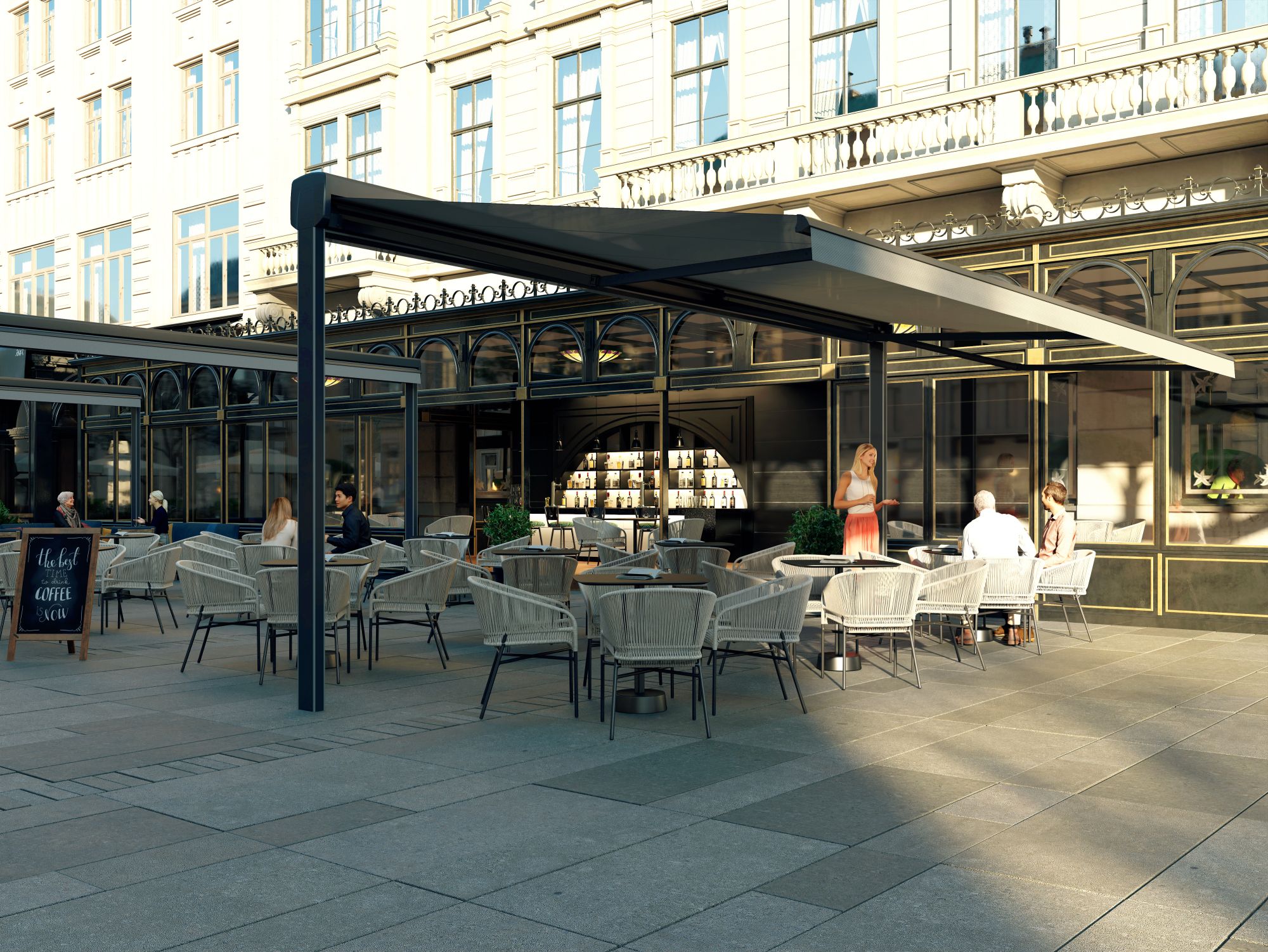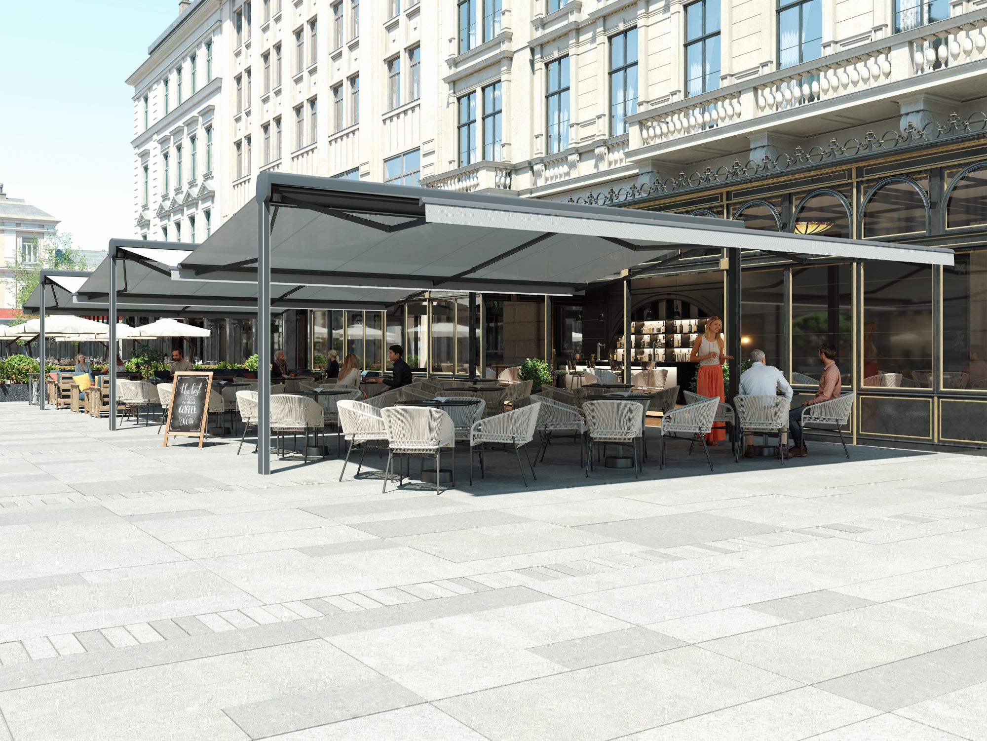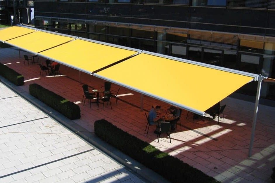 Die Standmarkise ist eine optimale Sonnenschutz-Lösung für Ihre Gastronomie Außenterrasse. Sie können Stühle und Tische frei stellen ohne einen störenden Mittelspfosten zu haben. Die flexiblen unabhänig steuerbaren Markisen können nach Bedarf ausgefahren werden, sodass ein passendes Ambiente entseht.DIe module Erweiterung ist eine clevere Lösung, da die nächste Standmarkise an die bereits vorhandene angebaut wird, so wird die Pfostenanzahl gering gehalten. Optionale Funktionen wie LED Beleuchtung oder Heizstrahler sorgen für Behaglichkeit, sodass Ihre Gäste den Aufenthalt in vollen Zügen genießen können.