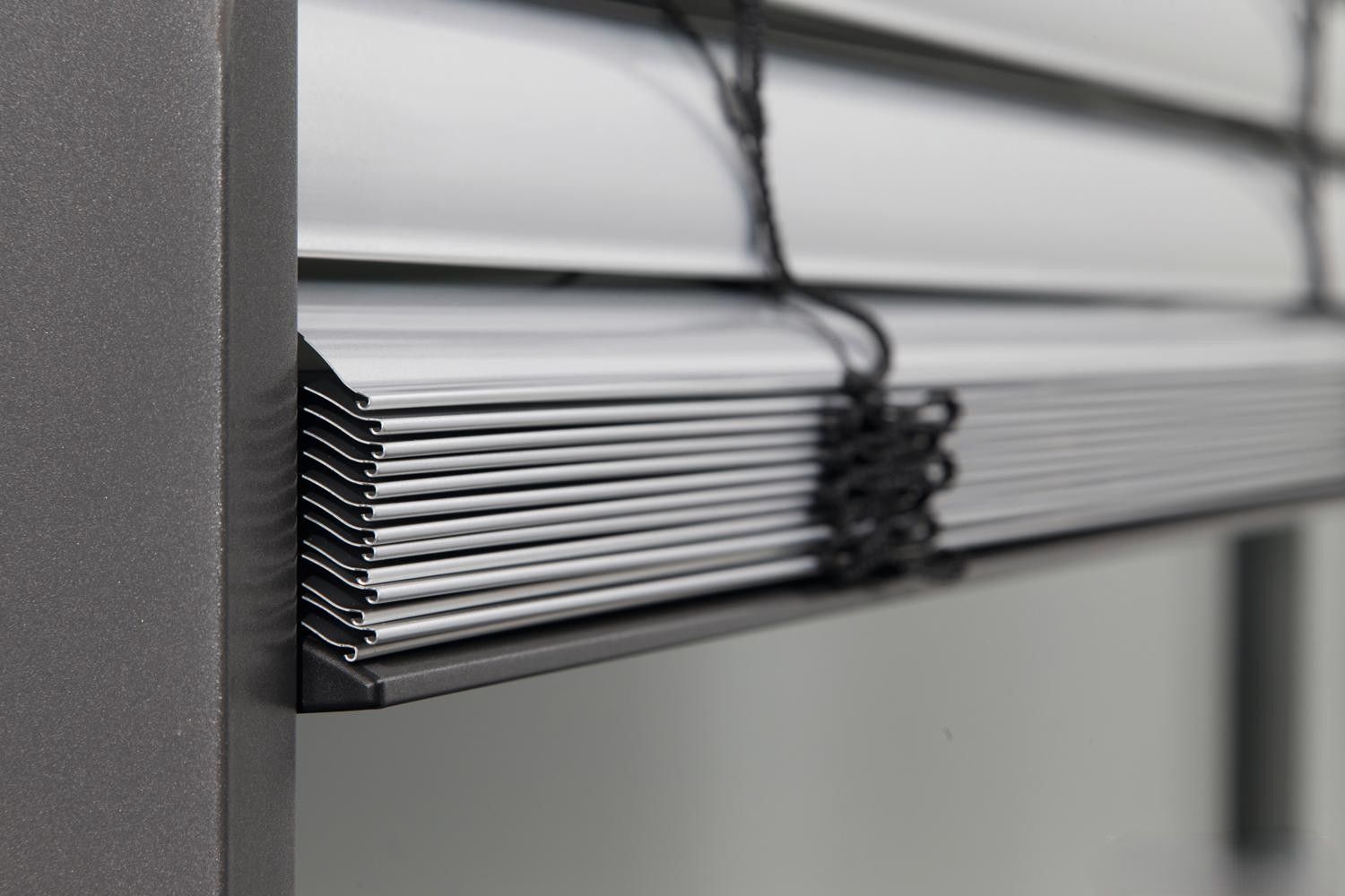 Der Vorbauraffstore für Fenster und Türen mit eckigem Kasten ist eine moderne Lösung, die sich unauffällig in das Erscheinungsbild eines kubischen Gebäudes integriert. Der eckige Kasten lässt sich hervorragend in die eckige Laibung integrieren und verschwindet so nahtlos. Der rechteckige Kasten sorgt dank klarer Linien für eine zeitlose Ästhetik und lässt sich leicht in verschiedene Architekturstile einfügen. Die robuste Bauweise des Kastens schützt den Raffstore im eingefahrenen Zustand vor Staub, Witterung und mechanischen Belastungen. Das Flächenprofil des eckigen Kastens bietet auf langer Distanz sehr stabilen Halt, da das Aluminiumblech gekantet ist, es trägt zu einer hohen Langlebigkeit des Sonnenschutzsystems bei. Zudem erleichtert die Form eine einfache Reinigung, da Ecken und Oberflächen weniger vertieft sind. Insgesamt bietet der Vorbauraffsore mit eckigem Kasten eine effektive, ästhetische und wartungsarme Lösung.