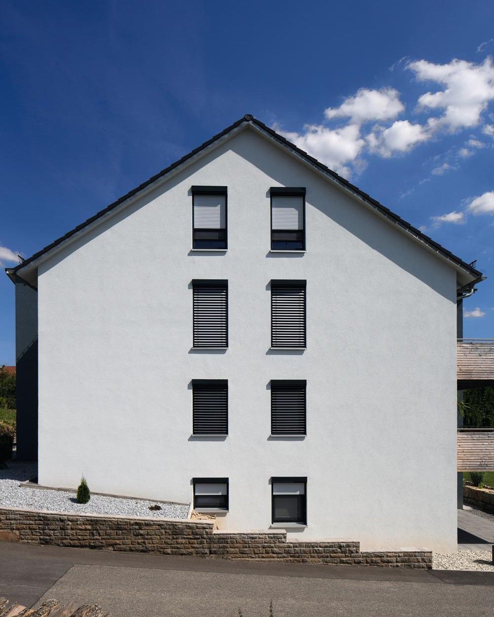 Der Vorbauraffstore für Fenster und Türen mit rundem Kasten präsentiert sich als zeitlose Lösung, perfekt für individuelle Bestandsbauten zum Beispiel mit Satteldach. Der runde Kasten bringt weiche Linien ins Spiel und verleiht dem Gesamtbild eine harmonische Optik. Diese Variante wird meistens auf die Fassade montierte und selten in die Laibung. Durch den abgerundete Kasten im Sichtbereich, wirkt die Kastenhöhe oftmals kleiner und somit unauffälliger an der Fassade. Die Form ermöglicht eine einfache Reinigung, der Schmutz spült sich bei Regen durch die Rundung sehr gut ab.