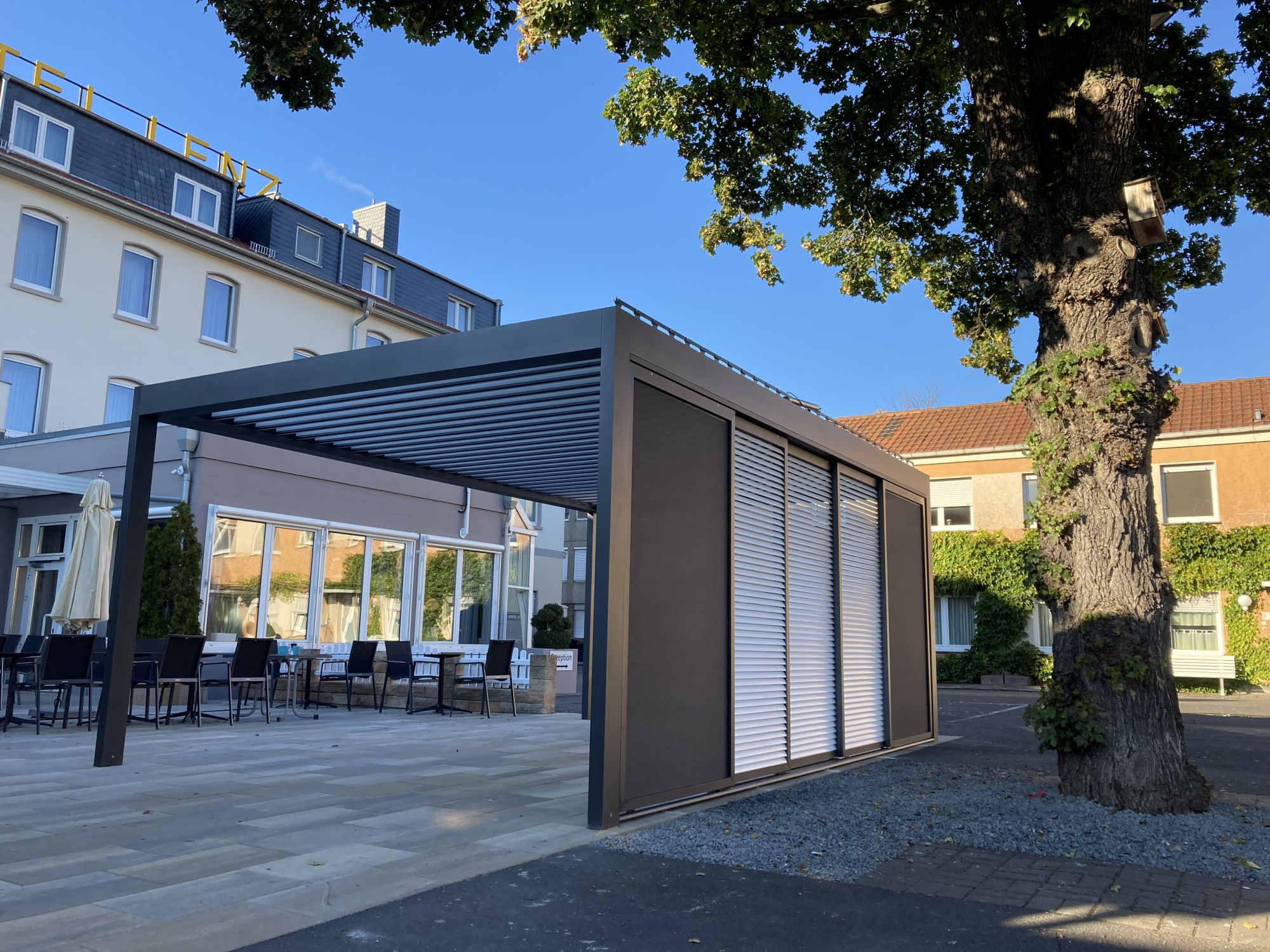 ZIP-Textilscreens grenzen den überdachten Bereich vom außenliegenden ab und bieten zuverlässigen Sonnenschutz, mit Sichtkontakt nach außen. Sie sorgen für klare Linien und ästhetische Eleganz, denn sollten diese nicht benötigt werden, fahren sie kompakt in die obige Kassette. Durch die seitliche Führung ist der ZIP-Textilscreen extrem windstabil und fungiert auch bei stärkeren Wind als Windschutz. Die Anlagen lassen sich stufenlos justieren, sodass Sie ganz nach Bedarf Schattenflächen entstehen lassen können. Dank Motorisierung oder smarter Steuerung erfolgt Bedienung bequem per Fernbedienung oder App.